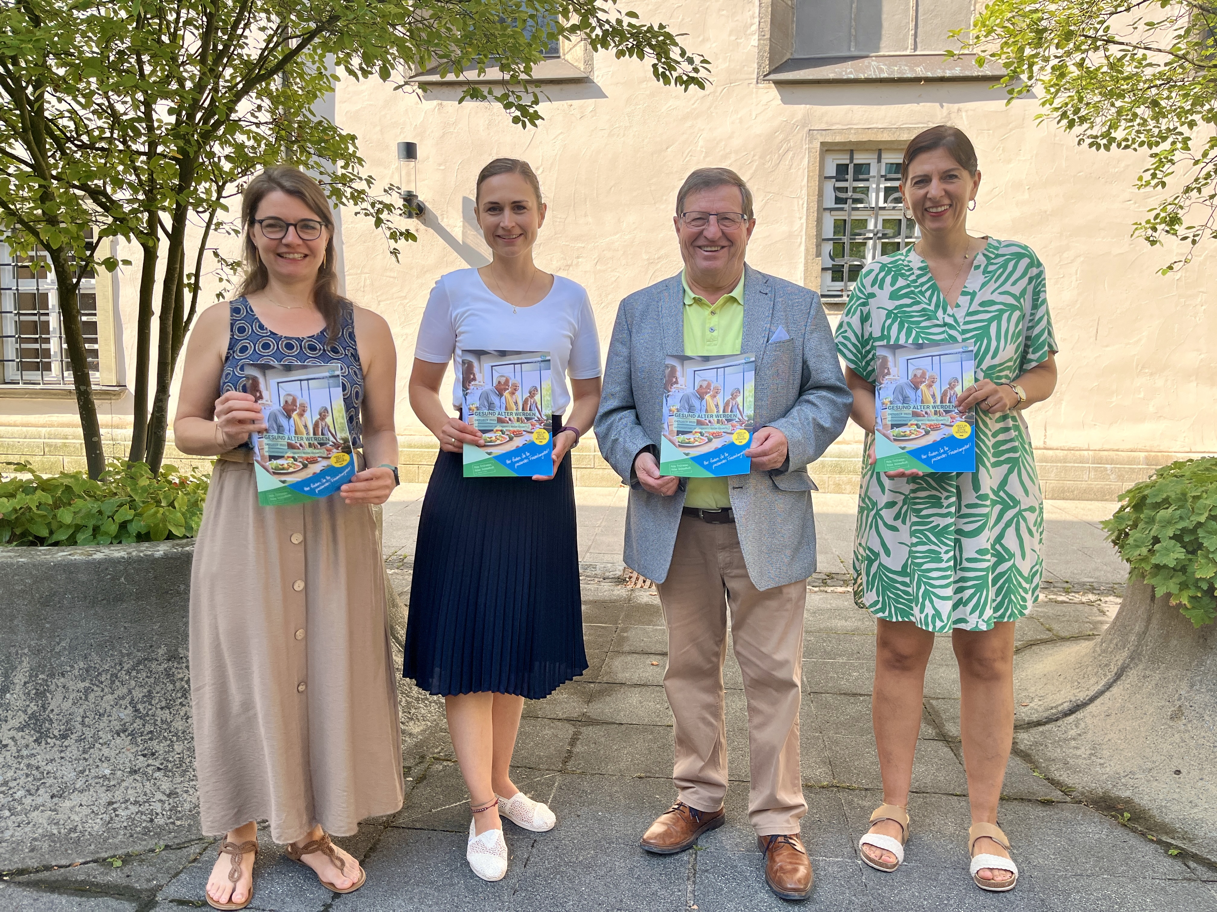 Bildunterschrift: Sie freuen sich über die bereits neunte Auflage des Aktionsmonats „Gesund älter werden“ im Landkreis Rhön-Grabfeld. (Von links) Veronika Enders (Fachstelle für Senioren und Menschen mit Behinderung), Susanne Stäblein (Gesundheitsregionplus Landkreis Rhön-Grabfeld), Stellvertretender Landrat Josef Demar sowie Evelyn Warmuth (Pflegestützpunkt Rhön-Grabfeld).