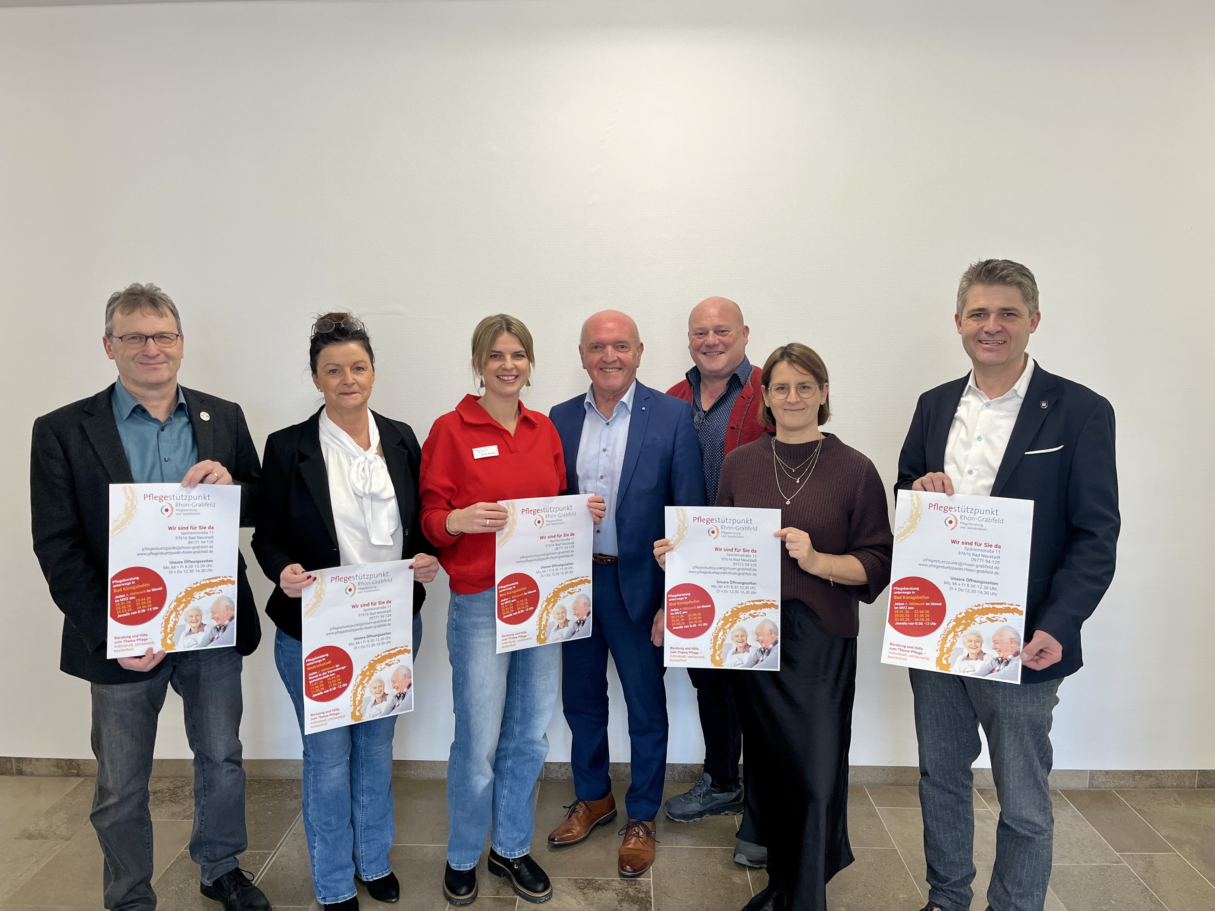 Bildunterschrift: Auch im neuen Jahr 2026 finden wieder die Außensprechstunden des Pflegestützpunkts Rhön-Grabfeld statt. Darüber freuen sich (von links) Thomas Helbling (Bürgermeister von Bad Königshofen i. Gr.), Gesine Dietze (Geschäftsführerin MVZ Rhön-Grabfeld), Kirstin Mühlfeld (Pflegestützpunkt Rhön-Grabfeld), Landrat Thomas Habermann, Georg Seiffert (Bürgermeister von Bischofsheim i. d. Rhön), Sabine Wenzel-Geier (Leiterin Pflegestützpunkt Rhön-Grabfeld) sowie Michael Kraus (Bürgermeister von Mellrichstadt).